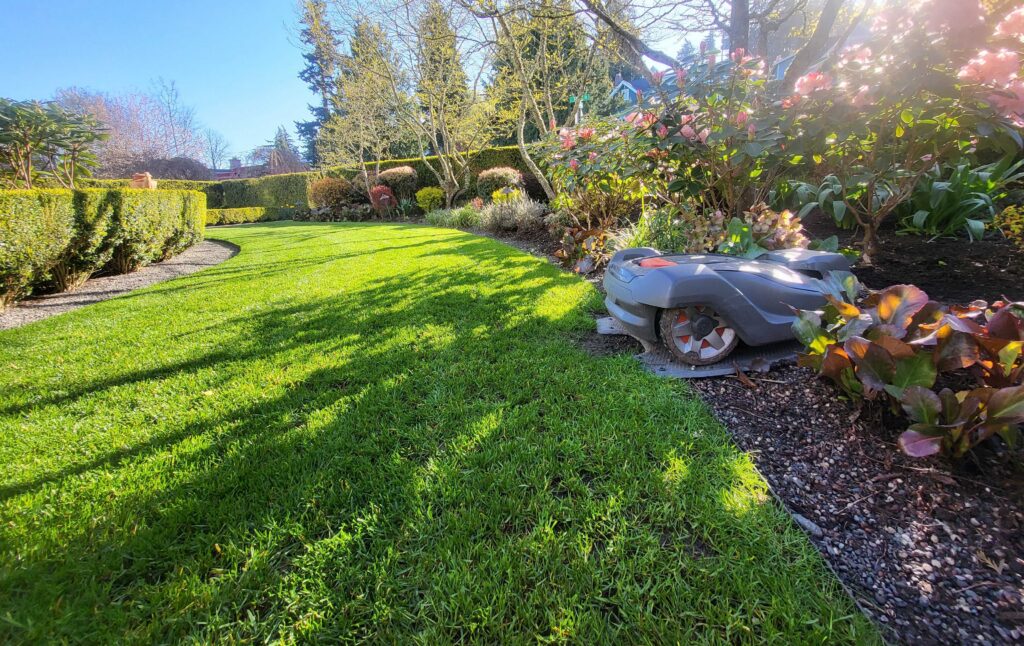 Tree canopy is the one real variable in the Pacific Northwest. We’re lucky to live somewhere with beautiful, mature cedar trees. But dense canopy can interfere with GPS satellite connection. For most Whatcom County properties, our GPS units connect without issue. For properties with heavy overhead cover, we install traditional in-ground boundary wire instead. It’s a slightly different setup but works just as well. We’re also currently testing a new GPS model that is built to perform in heavy canopy situations. Technology in this space is moving fast!
