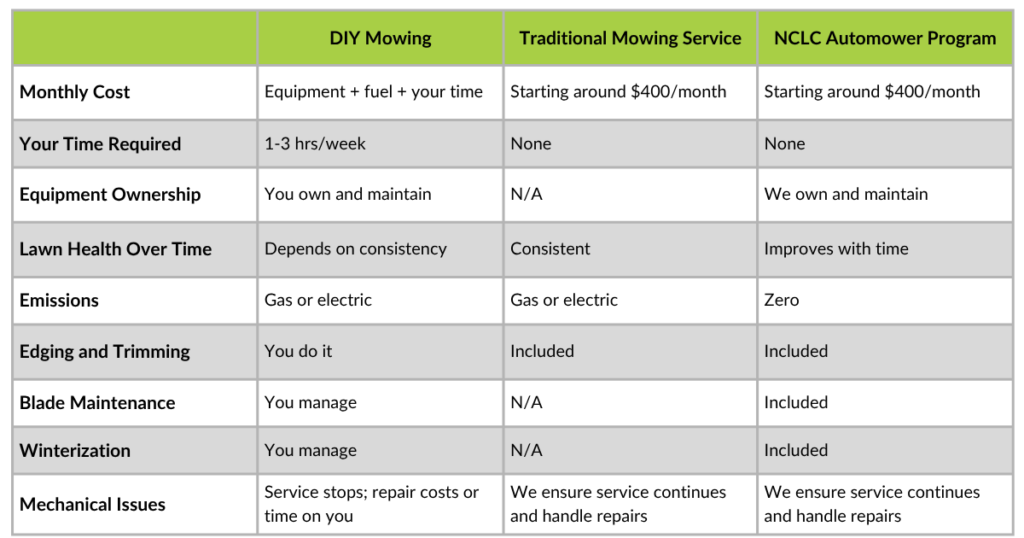 - You value a quiet yard with no engine noise and no crew disruption on Saturday mornings